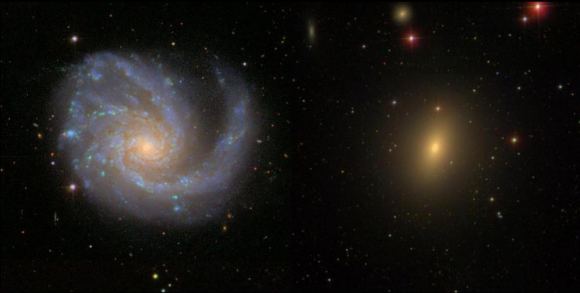 A spiral galaxy ablaze in the blue light of young stars from ongoing star formation (left) and an elliptical galaxy bathed in the red light of old stars (right). Credit: SDSS