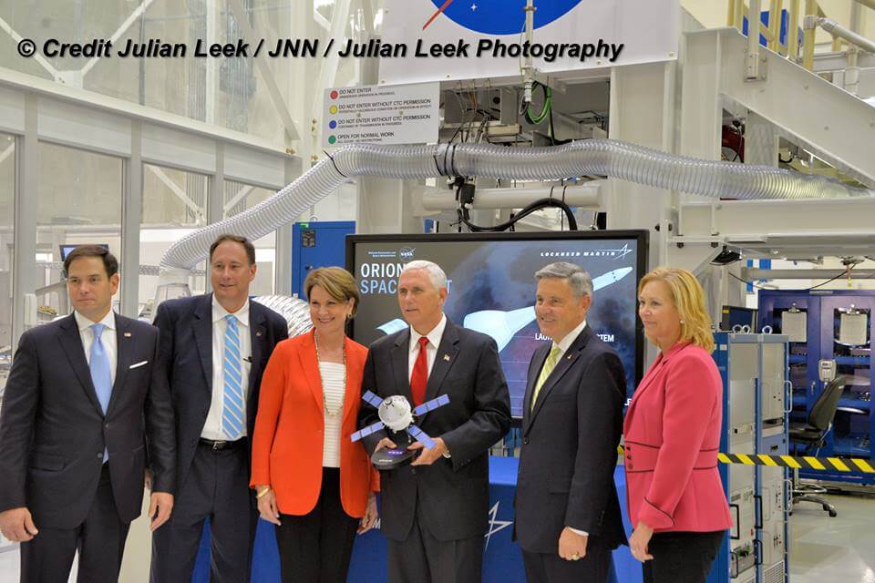 Vice President Mike Pence (holding Orion model) tours manufacturing of NASA’s Orion EM-1 crew capsule during July 6 KSC visit – posing with KSC Director/astronaut Robert Cabana, acting NASA Administrator Robert M. Lightfoot, Jr., Senator Marco Rubio, Lockheed Martin CEO Marillyn Hewson and KSC Deputy Director Janet Petro inside the Neil Armstrong Operations and Checkout Building. Credit: Julian Leek