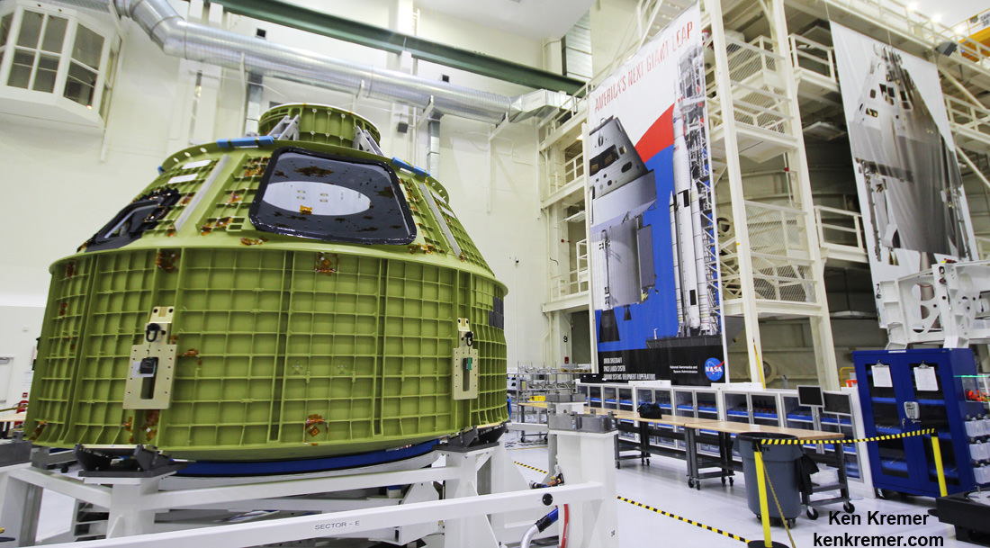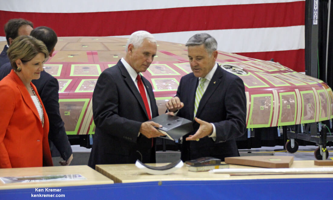 Pence toured the Neil Armstrong Operations and Checkout Building (O & C) where the Orion deep space capsule is being manufactured for launch in 2019 on the first integrated flight with SLS on the uncrewed EM-1 mission to the Moon and back – as I witnessed for Universe Today.