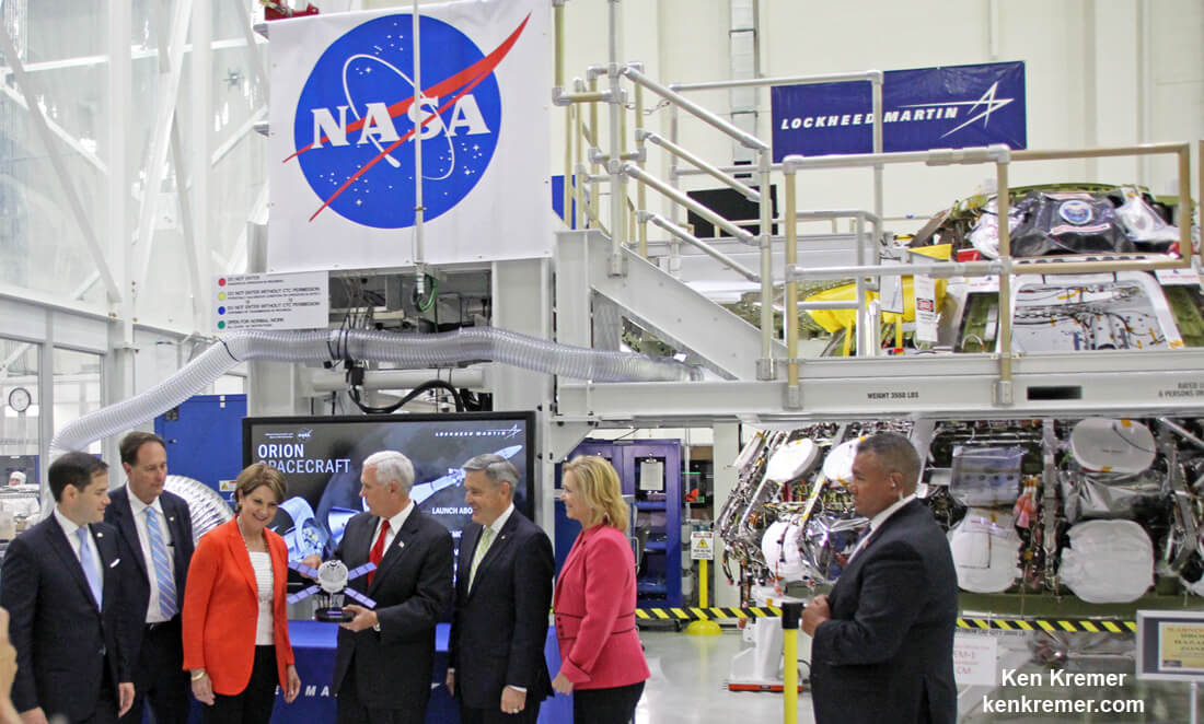 Vice President Mike Pence (holding Orion model) receives up close tour of NASA’s Orion EM-1 deep space crew capsule (at right) being manufactured for 1st integrated flight with NASA’s SLS megarocket in 2019; with briefing from KSC Director/astronaut Robert D. Cabana during his July 6, tour of NASA’s Kennedy Space Center – along with acting NASA Administrator Robert M. Lightfoot, Jr., Senator Marco Rubio and Lockheed Martin CEO Marillyn Hewson inside the Neil Armstrong Operations and Checkout Building at KSC. Credit: Ken Kremer/kenkremer.com